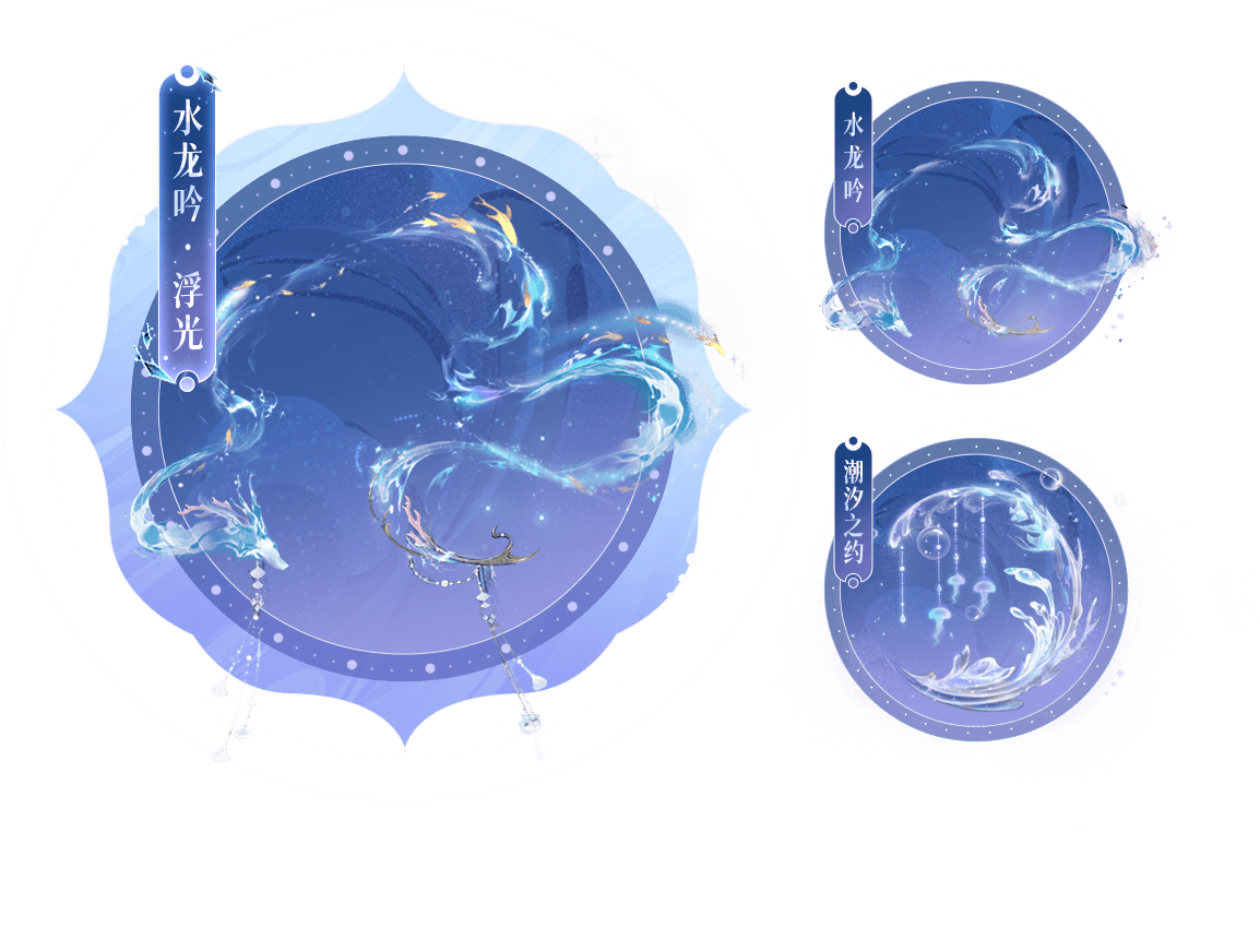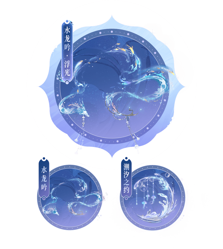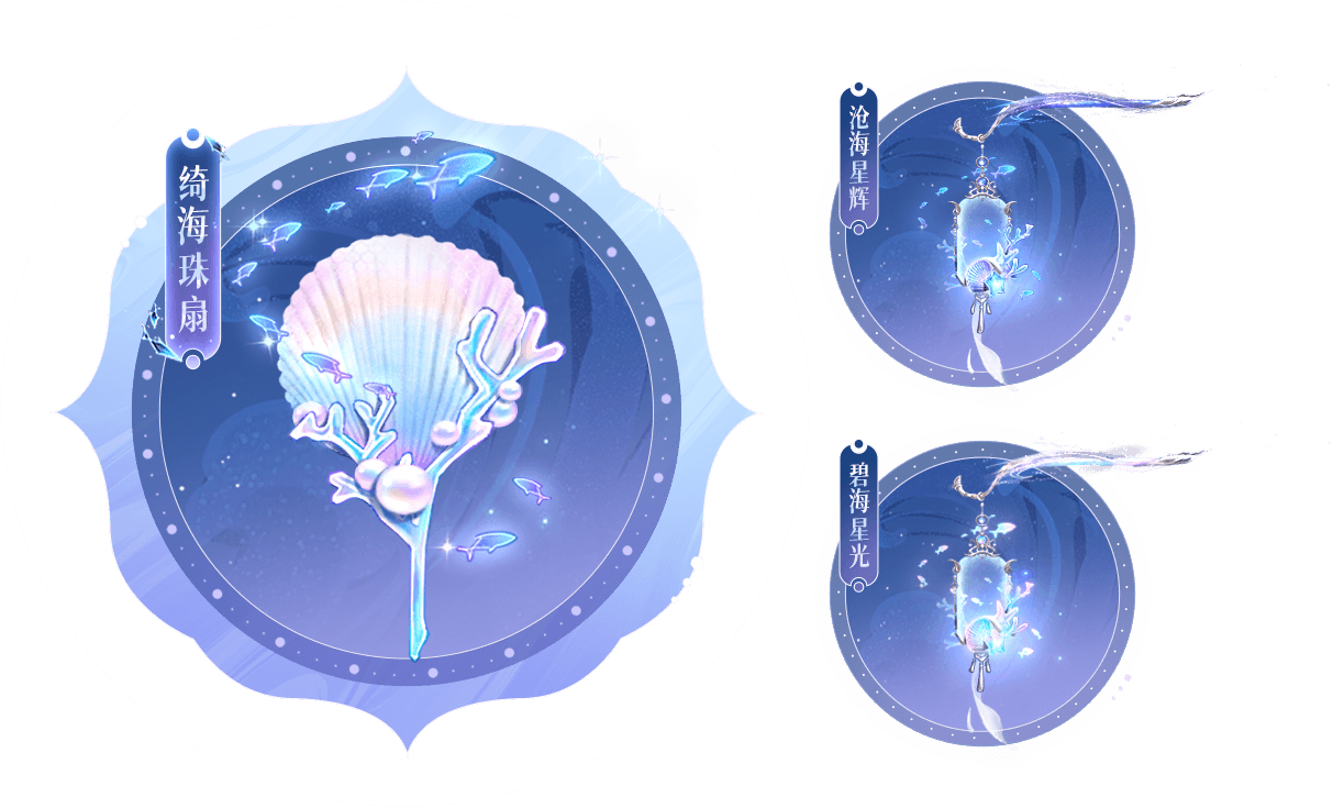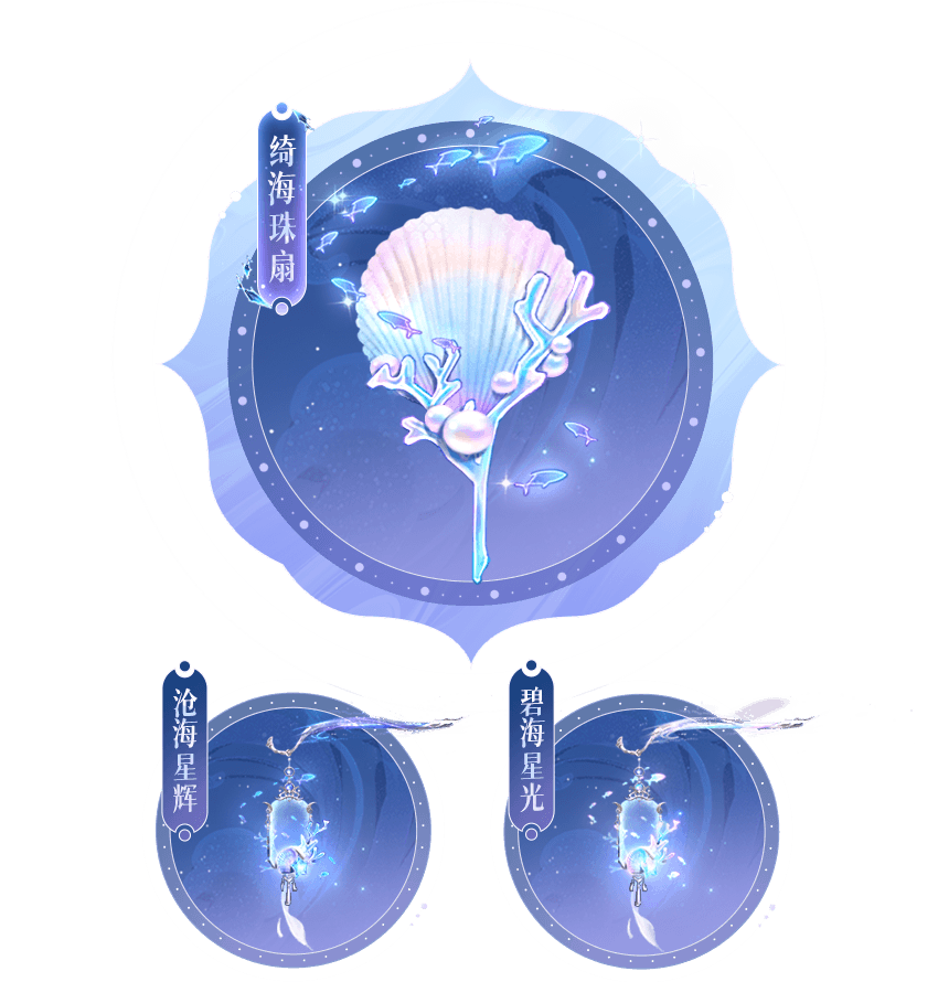 注:获取本期所有新品外观,可获得“海月仙跟宠卡”及时效为90天的“遇龙奇缘”称号。 点亮“沧溟翩影·遇龙”外套、发型、头像、“沧溟之冠”头饰、“缰绳·洋流歌者”、“沧海浮梦”武器幻魂图鉴,可获得“凌波客跟宠卡”和时效为90天的“沧海明珠”称号。