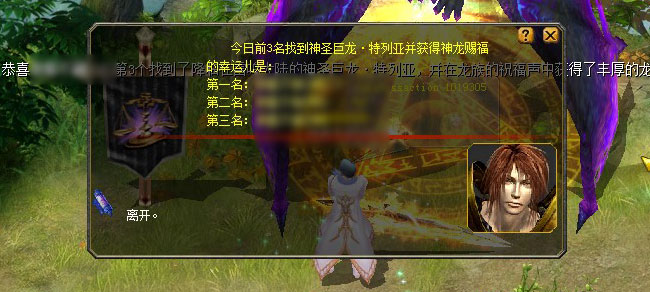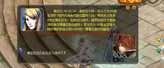在神龙降临期间,每位神龙将依次降临雷鸣大陆,并在雷鸣大陆逗留5分钟时间。并且只有前一位神圣巨龙已经离开大陆5分钟后,下一位神圣巨龙才会降临雷鸣大陆。 你只有在神圣巨龙逗留的短短5分钟内找到它,才能够获得这位神圣巨龙赐予的祝福宝箱。 当然了,虽然每位与神圣巨龙邂逅的冒险者都有奖励,却不是每个人的奖励都一样好。越早找到神圣巨龙的冒险者,获得的奖励当然也越好。你可以通过查看神圣巨龙身边的神龙赐福榜来查询前3名找到这位神龙的冒险者都是谁——他们的运气可真好!