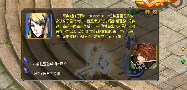 1、3月10日至3月14日龙抬头节日期间,与卡诺萨城的圣龙祭司艾玛娜交谈(343,399),了解神龙降临活动详情。 |