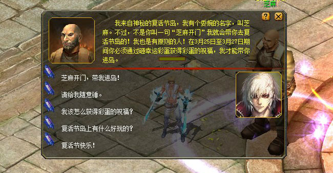 想要进入复活节道,你必须拥有“彩蛋的祝福”这一特权,不然,复活节大使芝麻可不会允许你进入复活节岛哦! 那么,怎么才能获得这个特权呢? 用复活节大使芝麻给你的随意锤砸开他身边的彩蛋,就有机会获得“彩蛋的祝福”及其它惊喜!注意啦:被下了魔咒的随意锤每天只能砸蛋10次,还有哦,“彩蛋的祝福”这个特权只会持续一天。