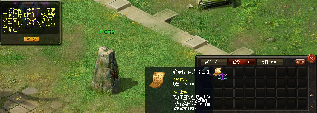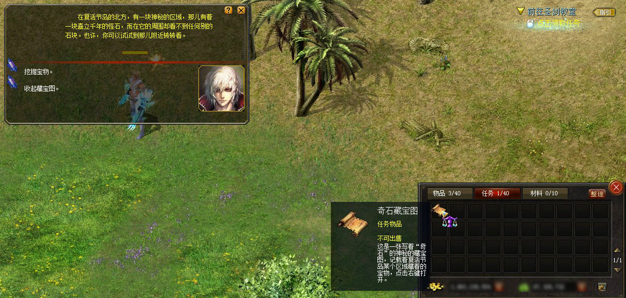 打开完整的藏宝图,根据上面的提示,去你认为对的地方挖宝。古老的藏宝图上的提示,你需要花点时间研究研究。 相信这些难不倒聪明的你。很快,你就找到了地方,挖到了宝贝——当然,你总是这么自信的! 另外,你也可拿着藏宝图碎片找探险家助手加尔换取小礼品,他可不是个小气的人哟!