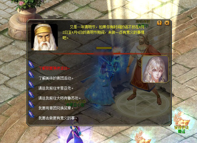 1、4月2日至4月4日清明节期间,前往卡诺萨城寻找清明神使克莱尔(330,381)了解活动详情,并在他的指引下前往卡诺萨城的大师克鲁苏(345,400)处领取祭奠神灵任务; |