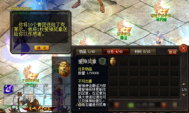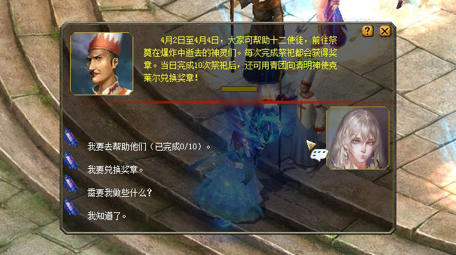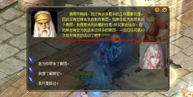终于,在经过一番努力之后,你帮助了某位神灵使徒完成了祭奠仪式,这位神灵使徒为了感谢你,将一枚神灵奖章交到你的手中。 当然,这并不是获得神灵奖章的唯一途径。清明神使克莱尔的手中也有不少神灵奖章,他很愿意用这些奖章来兑换一些美味的青团。只要给他10个美味的青团,他就会给你1枚神灵奖章。 当然,克莱尔手中的奖章数量也是有限的,你每天只能在他那里兑换10枚奖章,可不要太贪心哦。