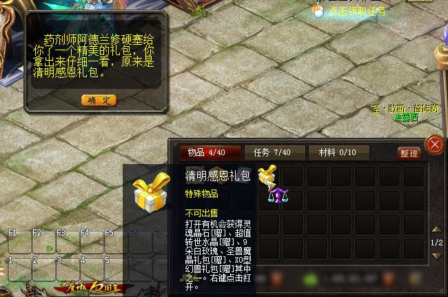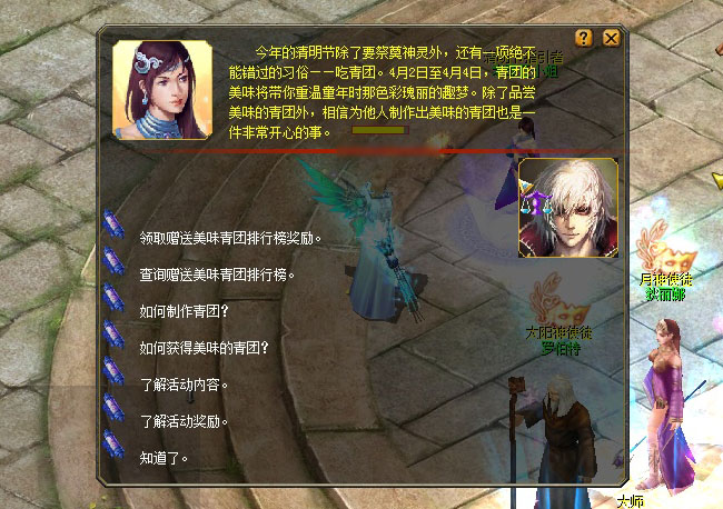 1、4月2日至4月4日清明节期间,到卡诺萨城找清明神使克莱尔(330,381)了解清明节活动安排。 |