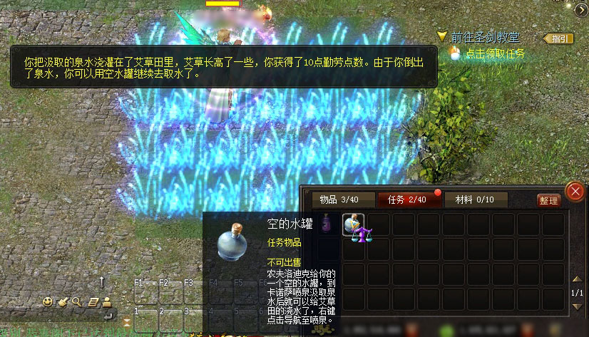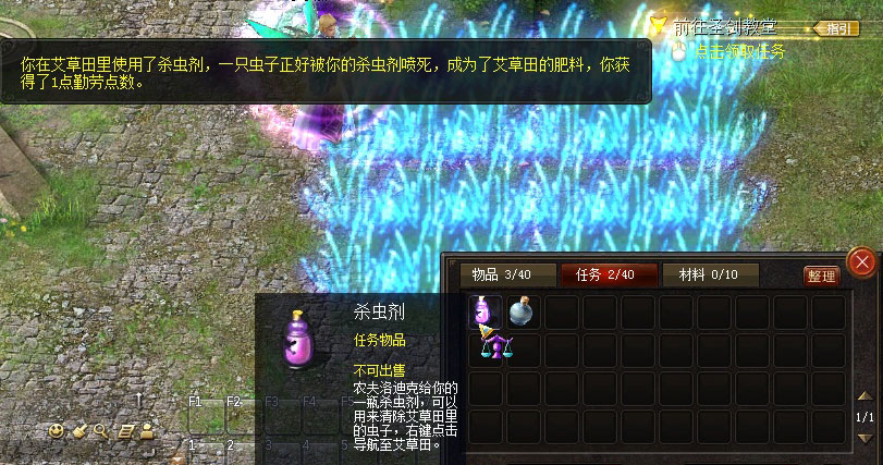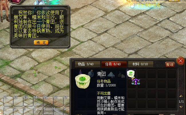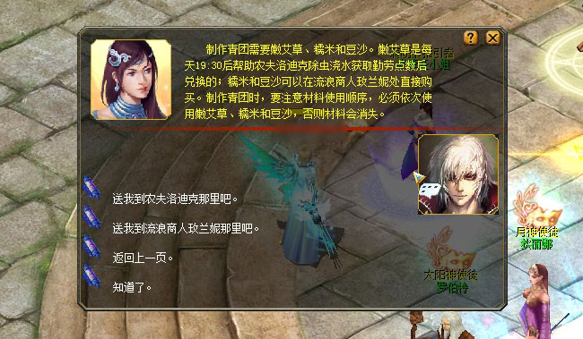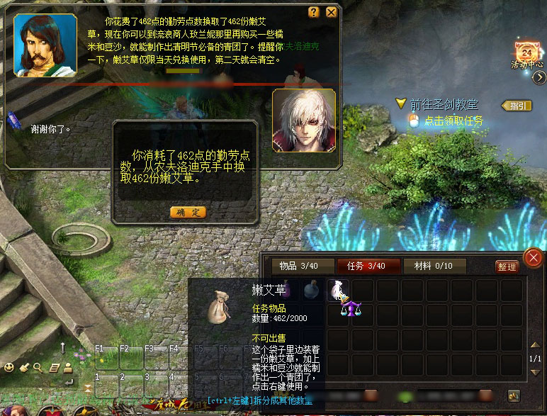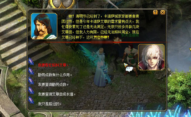 你可以从洛迪克那里领取一瓶杀虫剂,以便清除艾草田里出现的虫子,每次喷杀虫剂都有几率除虫成功,每次除虫成功可以获得1点的勤劳点数。 你也可以从洛迪克那里领取一个空水罐,拿着空水罐,去卡诺萨城的喷泉汲取泉水,然后将一罐泉水带到艾草田并帮助洛迪克进行浇水。每完成一次浇水,都可以获得10点勤劳点数。 每天当艾草田成熟了或者每天的20:30以后,你就可以到洛迪克处凭勤劳点数兑换嫩艾草,1点勤劳点数可以兑换1份嫩艾草。你也可以在20:30到23:00之间嫩艾草的成熟时段到艾草田里采集成熟的嫩艾草。 有了嫩艾草,你就获得了制作青团的第一种材料。当然,你还需要到卡诺萨城中的流浪商人玫兰妮那里购买糯米和豆沙。有了嫩艾草、糯米和豆沙,就可以开始制作青团了。 你必须要按照顺序依次使用嫩艾草、糯米和豆沙,才能制作出青团。若是顺序出错,青团制作就会失败,并且材料也会消失。