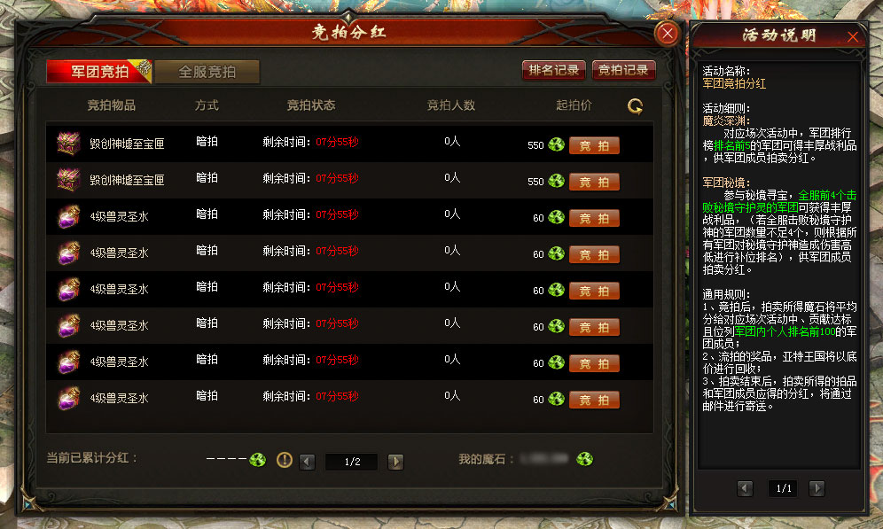 不过这还不是全部,全服前4个击败秘境守护神的军团,可对庇护之域至宝匣等战利品进行军团竞拍(若全服击败守护神的军团数量不足4个,则根据所有军团对守护神造成伤害高低进行补位排名)。军团内伤害排名前100名且伤害达到600亿的勇士,将有资格在军团竞拍后获得魔石分红。