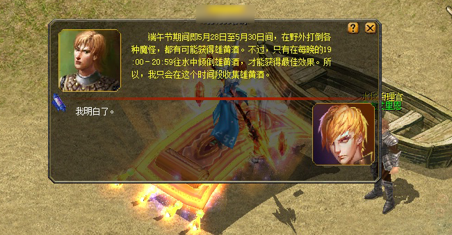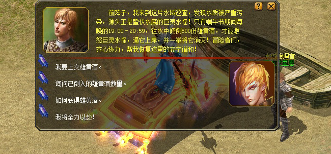 2017年5月28日至2017年5月30日可收集雄黄酒,每日19:00-20:59 将雄黄酒上交给水域治理官。 |