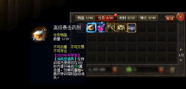 不确定平日的战斗训练是否取得了成效?想要知道自己的真实训练水平吗?纳邦德尔学院隆重推出的勇者特训塔,各位勇士可千万不要错过!2020年9月9日至2020年9月12日开学季期间,只要等级达到90级的勇士都可以前往特训塔参与特训挑战,同时还可斩获炼金秘砂与丰厚奖励。若你对此有兴趣,就去找卡诺萨城的纳邦德尔导师提坦斯(344,395)吧! 注:先锋区的活动时间为2020年9月2日至2020年9月5日。 特训塔每层都有1名勇者训练师驻守,每5层就有1名精英勇者训练师,每10层就有1名超级勇者训练师。 在你到达相应的层数后,可通过其中的训练石柱,召唤出当前层级的勇者训练师。 和勇者训练师展开战斗,并在3分钟内战胜勇者训练师即可通过挑战。 通过挑战后,你就可以在勇者宝箱处领取奖励并前往下一层,而每日首次击败勇者训练师还可以获得对于勇者们来说必不可少的炼金秘砂。 (注:炼金秘砂是炼制灵符的必备材料,而解读炼金灵符可获得神秘好礼。点击查看“学霸训练营”活动攻略) 特训塔每10层为1节点。该节点内,1至4层的挑战中,若你在2分钟内获胜,可跳层至5层进行挑战,若在1分钟内获胜,可直接跳层至10层进行挑战。而在5至9层的挑战中,若2分钟内获胜即可跳层至10层进行挑战。 注意!当挑战到整10层时,无法直接跳过该层数。 在跳层时,跳过层数的奖励可在勇者宝箱处一并领取。 特训塔前20层可获得体力自动回复效果,但挑战整5层和整10层时体力自动回复和一切治疗手段都将失效。 在通过整10层的挑战后,除了可获得相应奖励外,还可额外获得1份助战道具。 助战道具包括消耗型道具——使用后获得特定效果,道具消失;冷却型道具——使用后获得特定效果,道具进入冷却时间,冷却时间结束后可继续使用;携带型道具——携带在身上即可发挥作用。 消耗型道具——高级暴击药剂、普通暴伤药剂、高级暴伤药剂、普通神伤药剂、高级神伤药剂:可分别提升暴击值、暴伤值和神圣伤害;生命祝福灵药:可复活所有幻兽和恢复角色生命值;胜利之书、凯旋之书:可跳过当前层数;烈焰炸弹:可释放烈焰陷阱对勇者训练师造成伤害;替身木偶:可召唤替身雕像抵挡攻击。 冷却型道具——体能符石:消耗生命值换取体力值;血祭徽章:持续消耗生命值,换取伤害加成。 携带型道具——时光罗盘:延长挑战时间;普通星灵法杖、高级星灵法杖:击败整10层勇者训练师后,可提升角色伤害。 普通血能符文、高级血能符文:击败勇者训练师后,可恢复自身一定的生命值。 (注:继续上次挑战时,当日内获得的各类助战道具依旧可在特训塔内使用;在特训塔外使用将直接丢弃。) 而进入特训塔时,不同勇者等级的挑战者可获得不同数量的勇者特训徽记。当挑战者不满意自己所携带的助战道具时,可以使用勇者特训徽记进行随机更换。 (勇者等级1至3级、4至6级、7至8级以及10级的挑战者进塔时,可分别获得1份、2份、4份、6份勇者特训徽记。) 如果对自己当前的成绩并不满意,挑战者可以在挑战结束后,选择继续上一次的挑战,重复挑战当日已抵达的最高层,也可以重新开始新的挑战。 |