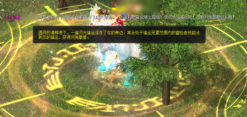 原来当冒险者使用嫦娥特殊技能“月舞仙钟”获得“盈月神辉”配件、“仙兔舞玲珑”或“飞仙共婵娟”套装时,附近都有机会出现月光福运。而处于月光福运笼罩下的冒险者,则可以获得月兔徽章的奖励!啊!突然有种心痛的感觉……