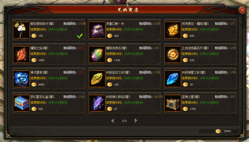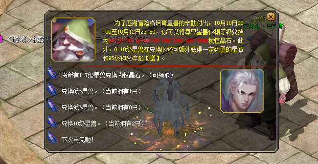 在培育星兽的过程中,以及参与其他国庆节活动中获得的星币,可以在卡诺萨城(349,386)处礼品店的商人土垚那里兑换相应的奖励。在享受节日的同时,不要忘记及时兑换奖励哦。 在活动结束之后,勇士们为培育的星兽而付出的精力也不会白费。 2025年10月10日0:00至2025年10月12日23:59期间,勇士们可以在农场主巴克斯处,用活动期间养成的星兽兑换奖励。1-10级的星兽可分别兑换不同数量的恒晶石,8-10级的星兽在兑换时还可额外获得星石和95级神火碎焰【赠】!星兽等级越高,可兑换的奖励也就越多哦! 注:先锋区可兑换星兽的时间为2025年9月30日0:00至2025年10月2日23:59,怀旧服为4-10级的星兽可兑换为新魔石,8-10级的星兽兑换时可额外获得灵魂晶石小礼包【赠】。