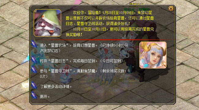国庆佳节来临之际,赫丽女王宣布,卡诺萨城将与梦幻星兽谷联合举办一场国庆休闲季活动。勇敢的冒险者们平日里颇为劳累,应该试着去享受一下假日的悠闲时光。 2025年国庆休闲季活动隆重上线,一起去星兽农场,培育可爱的梦幻星兽,赢取丰厚的奖励吧。 2025年9月28日至2025年10月9日期间,等级达到90级,成神并能够驾驭三宠的冒险者,可以在梦幻星兽谷的农场主·巴克斯(345,390)邀请下前往梦幻星兽谷度假,在星兽农场内培育可爱的星兽,与它们一同玩耍。赶紧去卡诺萨城拜访农场主巴克斯吧,他将送你前往星兽农场所在地。 注:先锋区的活动时间为2025年9月18日至2025年9月29日期间。怀旧服的活动参与条件为人物等级达到90级且可驾驭三宠。