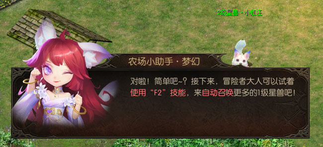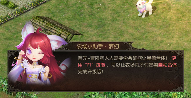 在农场主巴克斯的帮助下进入星兽农场之后,亲切可爱的小助手·梦幻会在第一时间教会你培育星兽的基础方法:如何使用技能召唤星兽以及怎样通过合成让星兽等级提升。