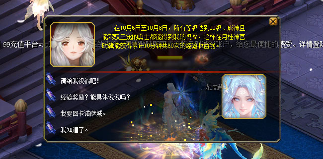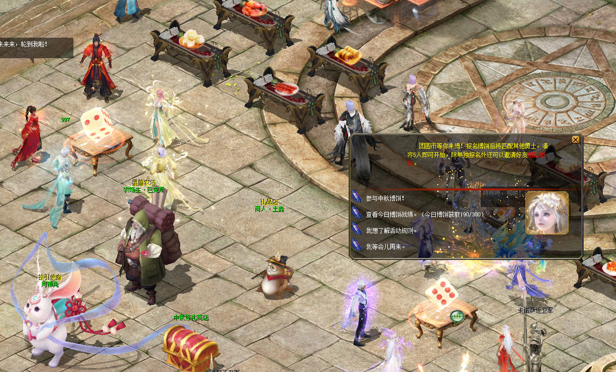 2025年10月6日至2025年10月8日期间,中秋佳期庆典将在卡诺萨城盛大举行。 (注:先锋区的活动时间为2025年9月28日至2025年9月30日) 【神宫庆典·欢乐博饼】 1、前往月桂神宫的博饼主持人或博饼桌子处,参与“欢乐博饼”。每人每日最多可通过博饼获取300枚团圆币【赠】。 2、每桌博饼报名人数满5人后,博饼即可开始。每人每轮有5次掷骰机会,每次掷骰后根据投掷出的点数,即可获得相应数量的团圆币作为奖励。 4、当所有人投掷次数用尽或博饼桌上的团圆币被全部领完时,此轮博饼结束。如果最后桌上所剩团圆币数量少于你所掷出的大奖,那么你将获得桌上的所有团圆币,并结束本轮博饼。 【神宫庆典·月仙子祝福】 1、在月桂神宫获得月仙子的祝福后,祝福将带给在神宫赏月的勇士们累计10分钟共60次的经验收益。 1)等级达到150级的勇士将获得双倍幻兽经验收益。 2)未满级的勇士则会得到升级经验和幻兽经验两种经验收益。 2、每获得6次经验收益后,勇士们还能得到团圆币【赠】奖励。 【神宫庆典·中秋美食】 每人每日首次品尝南北美食,可获得团圆币【赠】奖励。 |