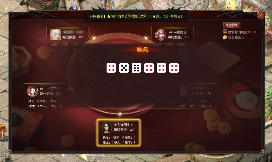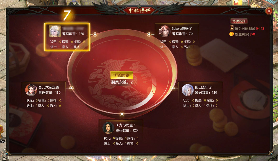 月桂飘香,花好月圆。2025年10月6日至2025年10月8日期间,神宫庆典开启,月神使者阿莲娜与勇士们共度浓情中秋。 注:先锋区的活动时间为2025年9月28日至2025年9月30日。 一年一度的“欢乐博饼”也将在月桂神宫举行。 先去博饼主持人处看看吧! 参加博饼,与大家一同掷骰,别有一番乐趣! 博饼可不是一个人的“战斗”,每桌报名人数需满5人方可开始博饼。除了独自一人参加,你也可以通过组队来和你的好友们一起来参与,独乐乐不如众乐乐嘛。 经过一段时间的等待后,你的对手也已准备就绪,博饼正式开始!每人每轮都有5次掷骰机会,根据所掷点数即可获得相应数量的团圆币。是博出状元题名,或是天秀之才?用辉煌的战绩证明自己吧! 值得注意的是,当桌上所有人投掷次数用尽或博饼桌上的团圆币被全部领完时,此轮博饼结束。如果桌上所剩团圆币奖励数量少于你所掷出的大奖,那你即可获得桌上所有奖励,并结束本轮博饼。所以抢占先机也很重要。 博饼结束之后,你还可以在博饼主持人或博饼桌子处回顾今日的辉煌战绩。可别忘了去和朋友炫耀一番哦。 中秋博饼牵人心弦,但在经历了一日的博饼狂欢后,你是否感到了一丝疲惫?如今夜幕将至,不如休憩一阵,去接受月仙子的祝福吧。 美妙的月色让你流连忘返,还获得了惊喜奖励。 除了美景外,怎么可以没有美食? 每人每日首次品尝南北美食,可获得团圆币【赠】奖励哦! 介绍了那么多,是不是已经跃跃欲试、迫不及待了?那你还在等什么,快去体验一下中秋的佳节氛围吧! |