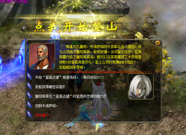秋日佳节又重阳,天高气爽好时光。2025年10月29日至2025年10月31日,每日在线时长满5分钟即可领取1份重阳在线礼包,每天仅限领取1份。 注:先锋区的活动时间为2025年10月22日至2025年10月24日。 在这秋日重阳佳节里,重阳节使者雷斯利又来到了卡诺萨城,指引勇士们前往城外的德加山登高远望,并为勇士们带来了能够祛病驱邪的重阳茱萸,作为勇士们登高望远之时的助力。 勇士们可在位于卡诺萨城的重阳节使者雷斯利处领取珍贵的重阳茱萸。 而说到重阳节,自然是少不了登高望远的传统习俗啦!勇士们可以在重阳节使者雷斯利的帮助下,前往卡诺萨城外的德加山登高远望,参与“登高竞速”。 勇士们可以在德加山山脚处的守山人莫多处开始“登高竞速”挑战,登上德加山山顶的耗时越短,所能获得的奖励就越丰厚哦! 在登山竞速挑战的过程中,勇士们将会面对山顶之上的诸多陷阱障碍,一旦受到陷阱干扰,就会大大影响竞速成绩,请尽力避开陷阱吧! 除了陷阱之外,竞速途中还有可能获得加速、传送、恢复生命等奇妙遭遇!想要在竞速中获得好成绩,运气也是不可或缺的一环呢。 踩中山道中的法阵将会触发一阵速度之风,让你的速度获得提升,更快地抵达山顶。 而地图上的“问号”标记,则可能是为你恢复生命的祝福,也可能是一处魔力风穴,将踏入其中的你直接卷到山路的前方。 除此之外,之前勇士们获得的重阳茱萸也能为登高竞速提供助力。在勇士们开始挑战时,重阳茱萸将会赋予勇士们一种随机的增益状态:提升初始移动速度、增加速度之风的加速幅度或抵挡一次陷阱。 在登上山顶、完成竞速之后,可别忘了重阳节的习俗!快在山顶的茱萸圃内插下茱萸吧。 插下茱萸后,勇士们即可前往茱萸圃园丁卡西处领取登高竞速奖励了。每位勇士每日仅能领取1次竞速奖励,不过若是对本次挑战的成绩不甚满意,勇士们也可以放弃领取奖励,重新进行挑战,来尝试取得更好的成绩! 除了茱萸馈赠好礼和登高竞速的奖励之外,在每日参与过“登高远望”之后,勇士们还可以前往重阳节使者雷斯利处额外领取1份重阳佳节登高礼【赠】!可千万不要忘记这份珍贵的馈赠哦。 相信在茱萸的香味和山顶的清新空气共同的作用下,今年的重阳佳节也一定会有滋有味。 |