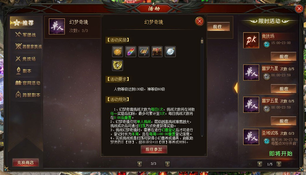 【活动规则】 1、人物等级达到130级且神等级达到60级的勇士每天可获得1次幻梦奇境挑战次数,挑战次数将在领取任一奖励后扣除,最多可累计至3次,每日挑战次数将在0:00后重置。 2、2025年9月9日起,可通过卡诺萨城的幻梦奇境传送阵(323,348)可前往挑战“幻梦奇境”,也可通过“活动—推荐—幻梦奇境”开启挑战。 注:先锋服时间为2025年8月20日起。 3、幻梦奇境仅可单人挑战,每次挑战均需消耗1次挑战次数,梦境层级越高挑战难度越大,挑战成功后可通过扫荡方式快速获得奖励。完成挑战或是扫荡均可获得奖励。 |