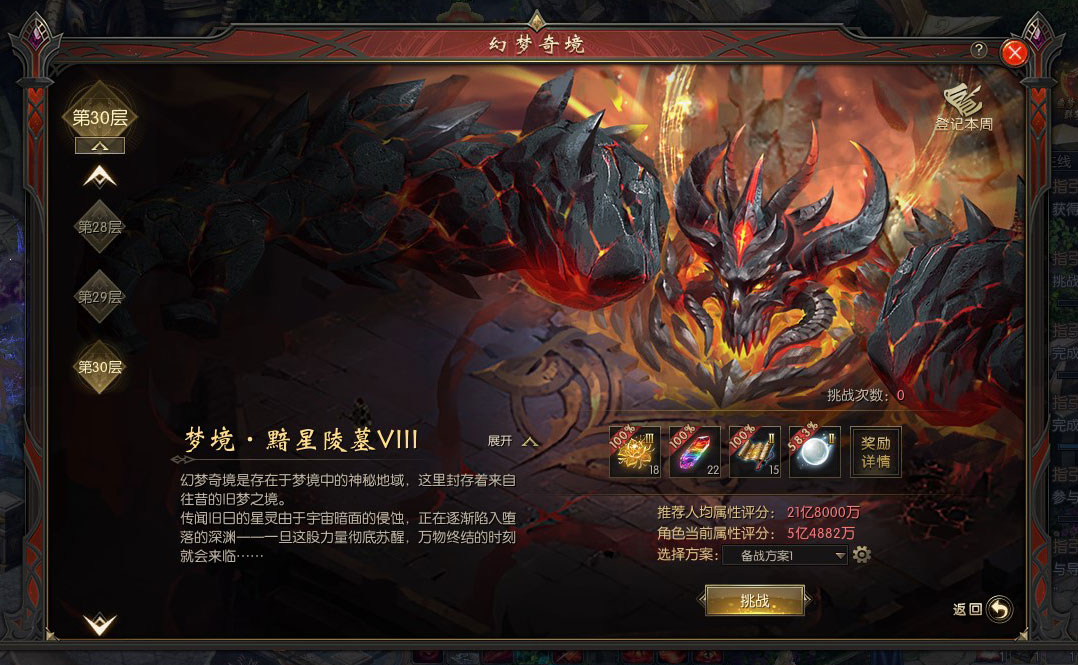 幻梦奇境是存在于梦境中的神秘地域,这里封存着来自往昔的旧梦之境。2025年9月9日起,幻梦奇境的入口将会开启,4种梦境共同交织,构筑成庞大的梦境国度。 注:先锋服时间为2025年8月20日起。 通过卡诺萨城的幻梦奇境传送阵(323,348)可前往挑战“幻梦奇境”,或也可通过“活动—推荐—幻梦奇境”开启挑战。 人物等级达到130级且神等级达到60级的勇士每天可获得1次幻梦奇境挑战次数,挑战次数会在领取任一奖励后扣除,最多可累计至3次,每日挑战次数将在0:00后重置。 幻梦奇境仅可单人挑战,每次挑战都需要消耗1次挑战次数。随着梦境层级的逐渐提升,挑战难度也会越来越大。每层梦境都配有推荐属性评分,可参考评分提升实力,挑战层层梦境。 挑战成功后,解锁扫荡方式,通过它来快速获得奖励啦——节省时间,效率超高! 每次扫荡都需要消耗1张幻梦奇境扫荡券,并且需要扣除1次挑战次数。扫荡层数虽然可以任选,但自身的属性评分需高于所选层数的推荐属性评分。 完成挑战或是扫荡均可获得奖励。 现在就进入幻梦奇境,挑战梦境,收获属于你的战利品吧! |