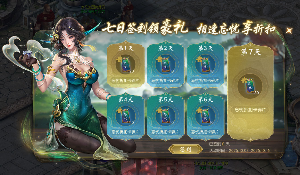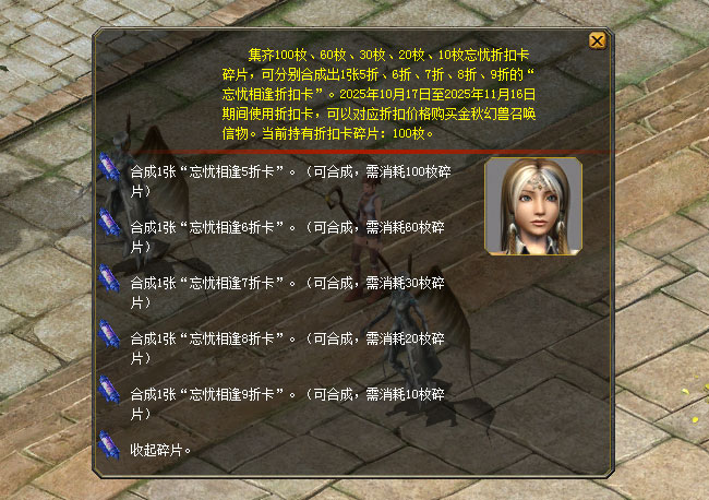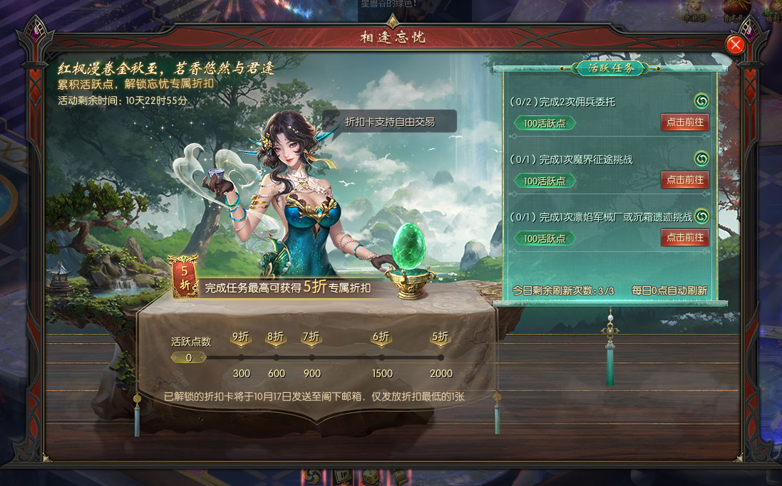 非怀旧服: ·活动期间每日完成“荒古火墓”挑战、“失落黄金城”挑战等日常活跃任务,即可积累“相逢忘忧”活动的活跃点。 ·每日可完成3次活跃任务,每个活跃任务可累积100活跃点。累积活跃点至2000,即可解锁最低5折折扣的“忘忧相逢折扣卡”。 注:非怀旧服的勇士们仅可通过“相逢忘忧”活动获得1张折扣卡——已解锁折扣最低的那张。非怀旧服的折扣卡将通过邮件发放,先锋区发放时间为10月15日,非先锋区发放时间为10月17日。 怀旧服: ·活动期间参与“相逢忘忧”签到活动,签到满7日,即可领取共计100枚的“忘忧折扣卡碎片”,合成最低5折折扣的“忘忧相逢折扣卡”。 注:折扣卡碎片仅限怀旧服获取。 折扣卡使用: 2025年10月17日至2025年11月16日期间,消耗“忘忧相逢折扣卡”,即可以对应折扣的优惠价格购买“山神佑世簪”——使用后可召唤金秋幻兽“御山司茗·忘忧”前来助阵。 注:先锋区折扣卡可购买“山神佑世簪”的时间为10月15日至11月14日。折扣卡均支持自由交易,每张折扣卡仅可购买1件召唤信物。 |
