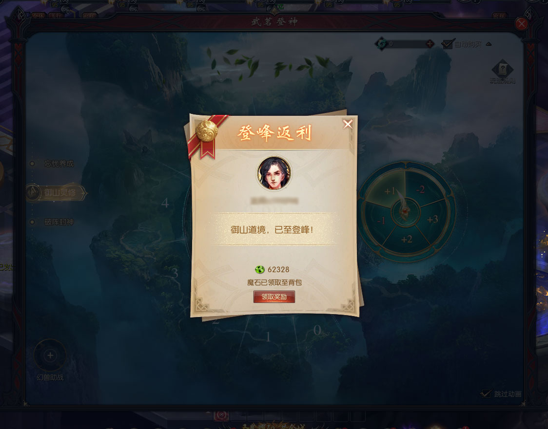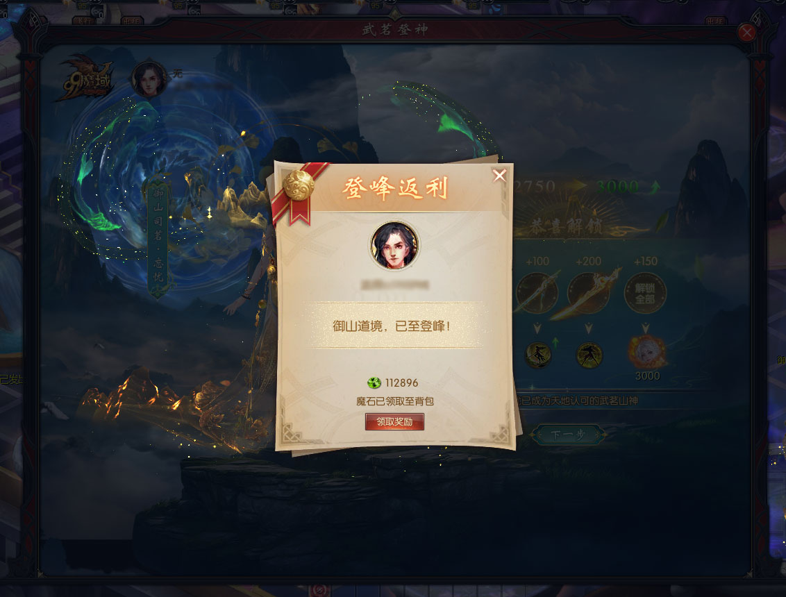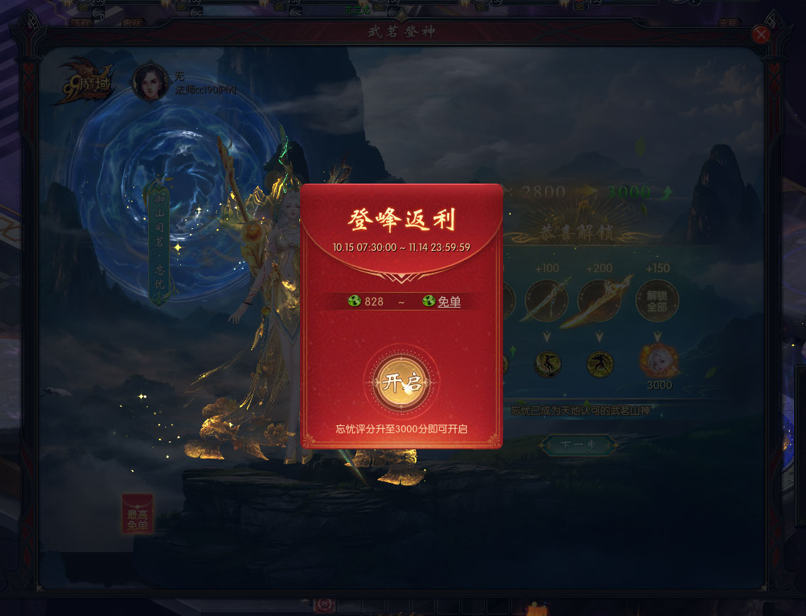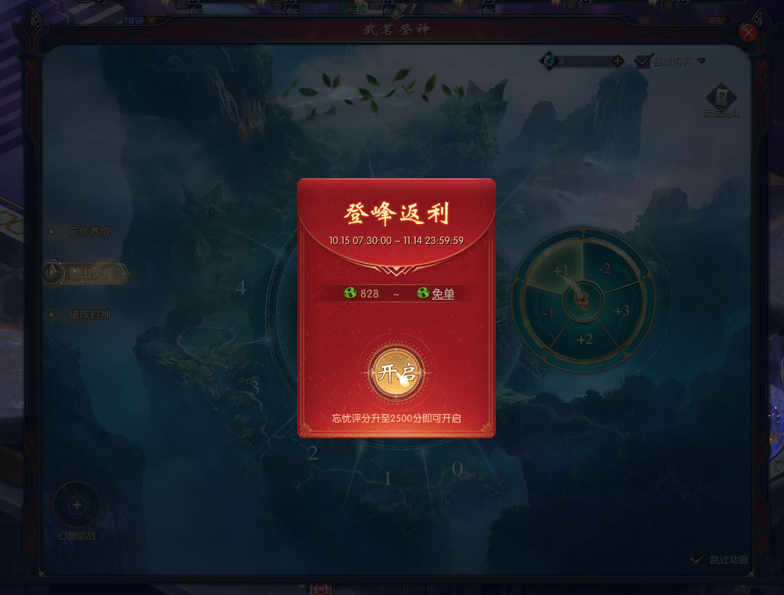 2025年10月17日至2025年11月16日(先锋区活动时间为2025年10月15日至2025年11月14日)返利活动期间,阁下在“武茗登神”中消耗武茗翡玉进行“御山灵修”,将忘忧套装评分提升至2500分后,可开启1次登峰返利红包,获取828点至45540点魔石返利甚至免单返利!