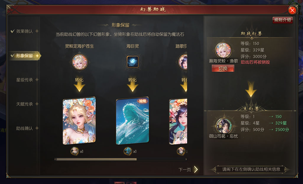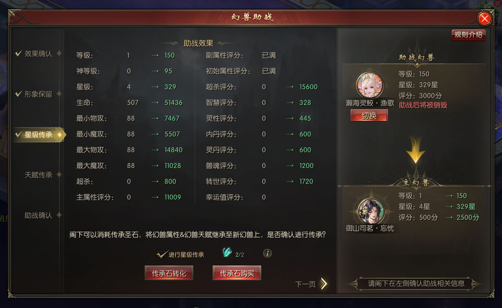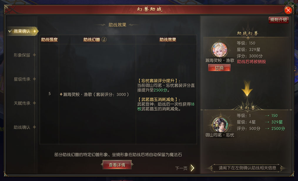 在幻兽助战的星级传承仪式中,可选择消耗对应数量的传承圣石·忘忧,将助战幻兽的星级与等级传承给主幻兽——御山司茗·忘忧,副幻兽星级需高于主幻兽。