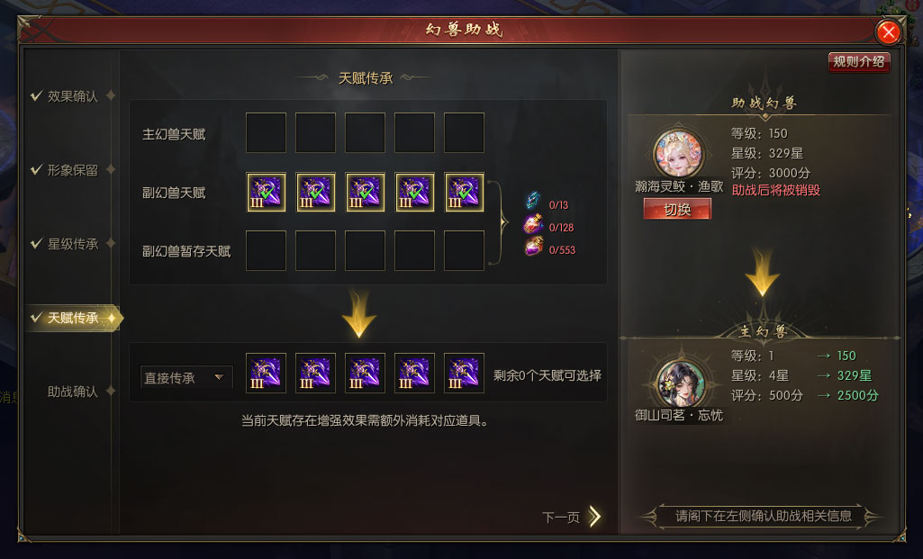 在幻兽助战的过程中,可选择助战幻兽的天赋进行传承,让主幻兽——御山司茗·忘忧拥有助战幻兽相同的天赋,传承天赋时需要根据天赋等级和天赋类型消耗一定数量的兽灵圣水。若传承的天赋为增强过的天赋,还需额外消耗对应数量的异兽晶魄或高级异兽晶魄。