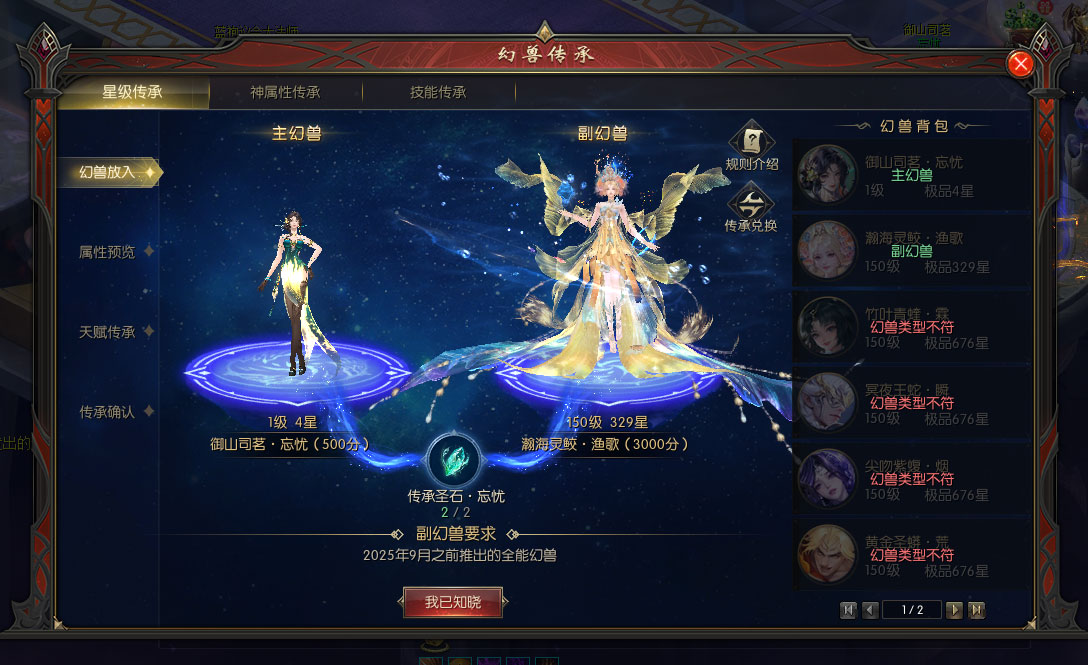 在星级传承仪式中,消耗对应数量的传承圣石·忘忧,即可将副幻兽——2025年9月之前推出的全能幻兽的星级与等级传承给主幻兽——御山司茗·忘忧。