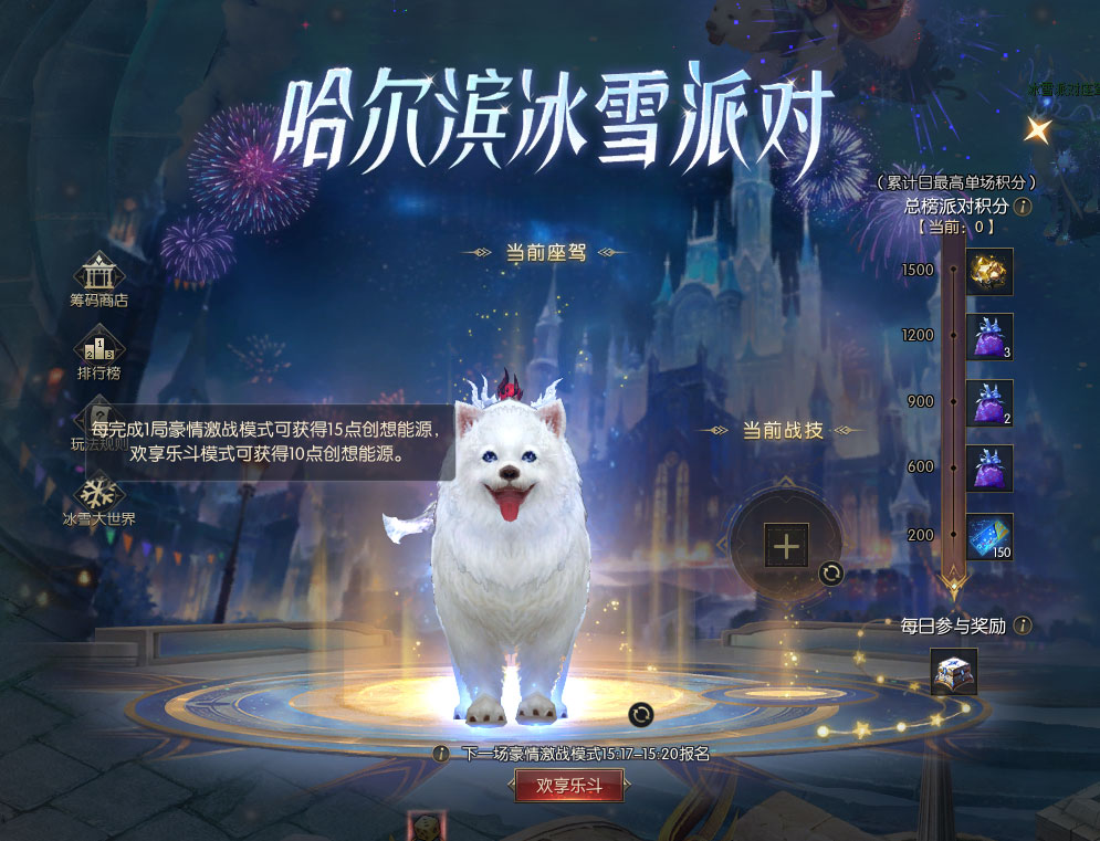 冰雪派对有2种竞赛模式,一个是活动期间全天开放,可随时报名参加的“欢享乐斗模式”,而另一个则是仅在活动期间每天15:20、16:20、17:20、20:20、21:20、22:20时各开启1场的“豪情激战模式”——参与派对,获得派对积分,激情冲击榜单之巅!