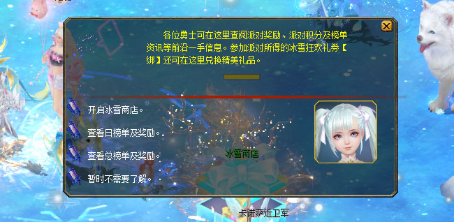 如果想要获悉榜单资讯,以及使用冰雪狂欢礼券兑换派对精美礼品,可在派对兑奖资讯站(347,391)和(199,411)处进行查询和兑换。