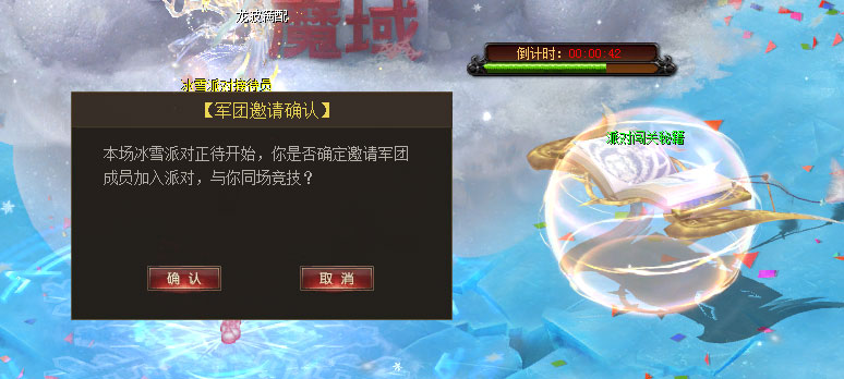 通过冰雪大世界向导·爱莎(199,417)、冰雪派对接待员·尼雅(345,394)或是打开背包中的冰雪狂欢邀请函,来开启“冰雪派对”界面,前往参与冰雪派对。
