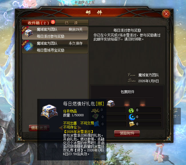 每日首次完成1场冰雪派对(2种模式均可),可以获得主办方送上的1份每日燃情好礼包【绑】——开启礼包,就能获得今日份的冰雪狂欢礼券【绑】,燃动你的冬日激情!