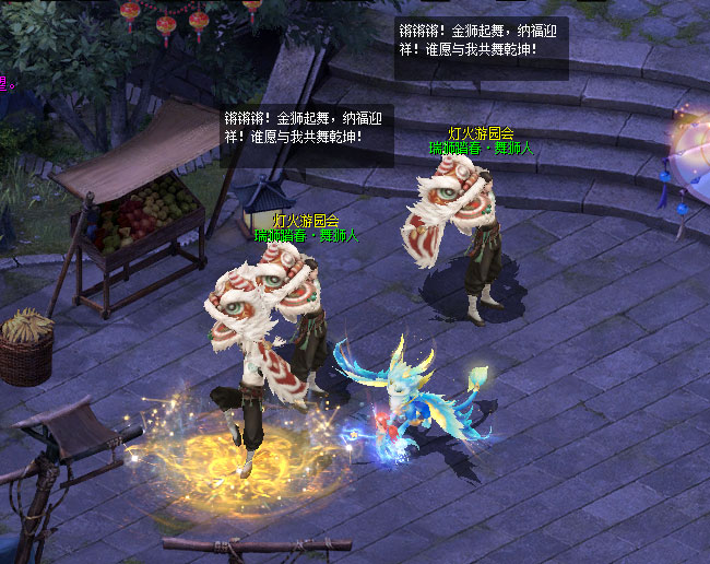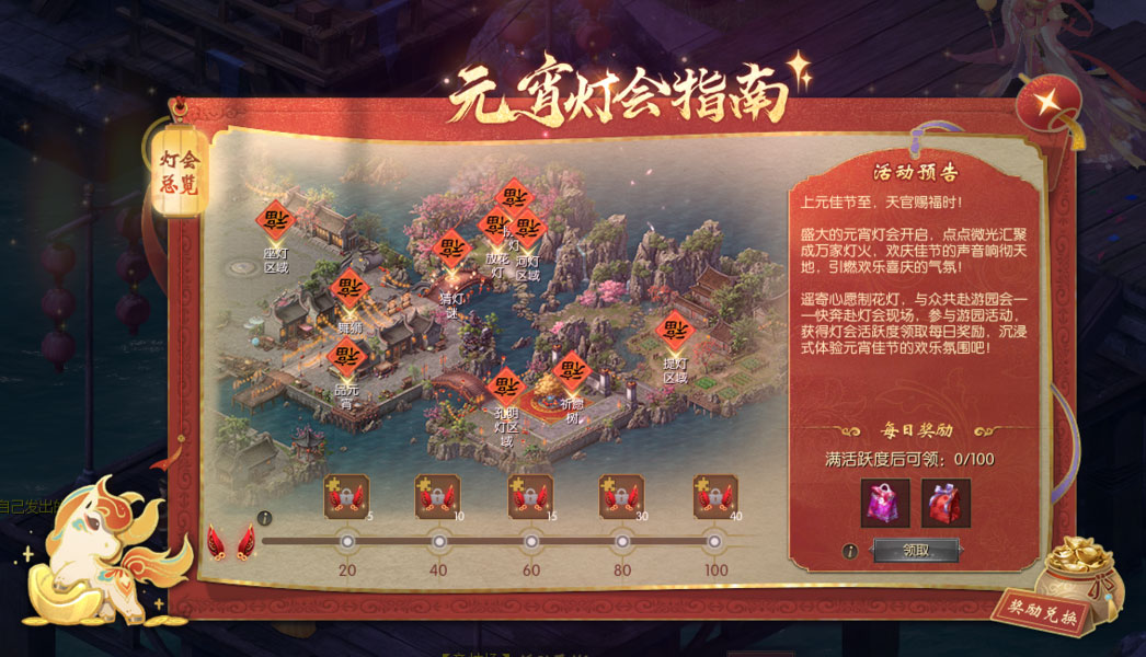 【灯会活动2】瑞狮踏春 金狮起舞,纳福迎祥。勇士们可以前往“瑞狮踏春·舞狮人”处加入舞狮行列,化身舞狮少年,与众人一同舞狮,享受节日的欢乐气氛。 每日首次参与舞狮可获得20点灯会活跃度。