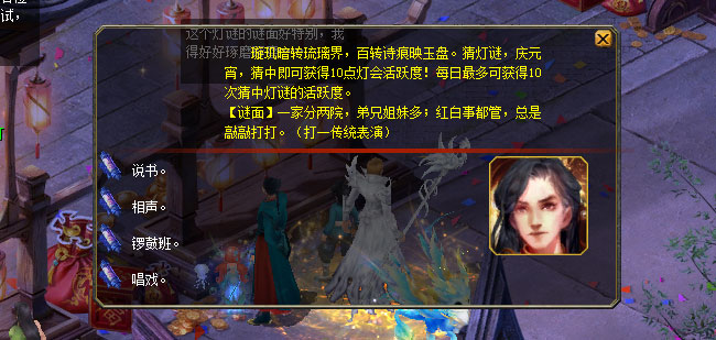 花灯朵朵衬元月,火树银花闹金宵!2026年3月3日维护后至2026年3月5日23:59,徜徉灯火游园会,参与各类趣味活动,积累灯会活跃度,点亮属于你的元宵记忆! 注:先锋区的活动时间为2026年3月1日维护后至2026年3月3日23:59。 每参与一项灯会活动,就可获得对应点数的灯会活跃度。当累积满100点,就可以领取节日礼包啦!请注意:灯会活跃度每日重置。 【灯会活动1】谜灯映福 璇玑暗转琉璃界,百转诗痕映玉盘。勇士们可以前往散落各处的“谜灯映福·谜花灯”处,查看映照其中的灯谜,用智慧破解谜题。 每次猜中都可获得10点灯会活跃度,每日最多可获得10次猜中灯谜的活跃度,共计100点。
