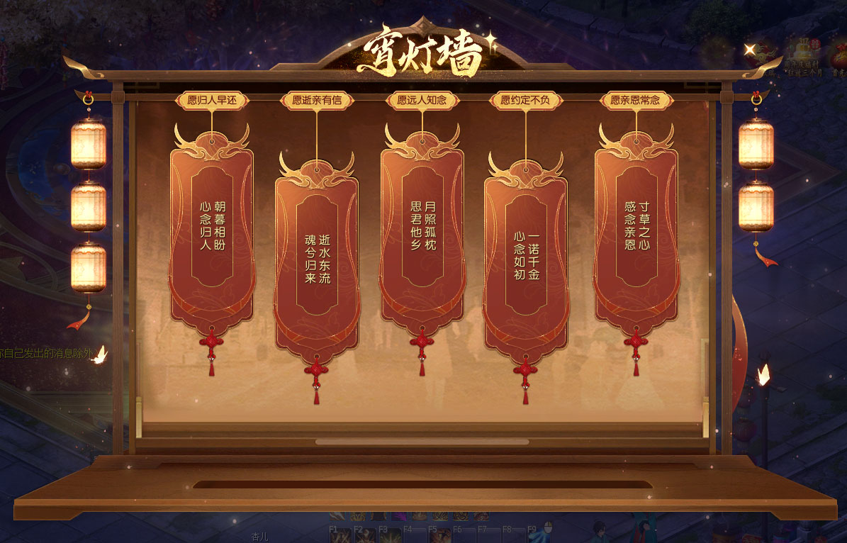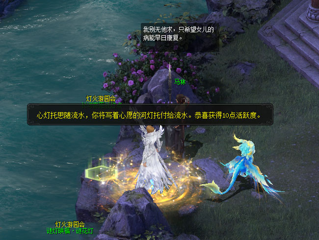 【灯会活动3】长河寄愿 心灯托思随流水,满载心愿入星河。勇士们可前往“长河寄愿·放灯点”处,将写着心愿的河灯托付给流水。 每次放河灯可获得10点活跃度,每日最多可获得5次放河灯的活跃度,共计50点。