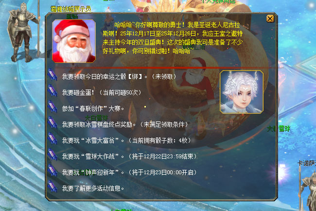 喜迎圣诞,欢庆元旦,银装素裹的卡诺萨城中,“双旦庆典”再度来临!本次庆典,将由圣诞老人尼古拉斯主持,幽默风趣的他为各位勇士们带来了许多趣味游戏以及精美礼品。 注:活动分为圣诞部分与元旦部分: 圣诞部分活动时间为2025年12月24日至2025年12月29日。 元旦部分活动时间为2025年12月30日至2026年1月2日。 先锋区·圣诞部分活动时间为2025年12月17日至2025年12月22日。 先锋区·元旦部分活动时间为2025年12月23日至2025年12月26日。