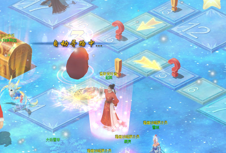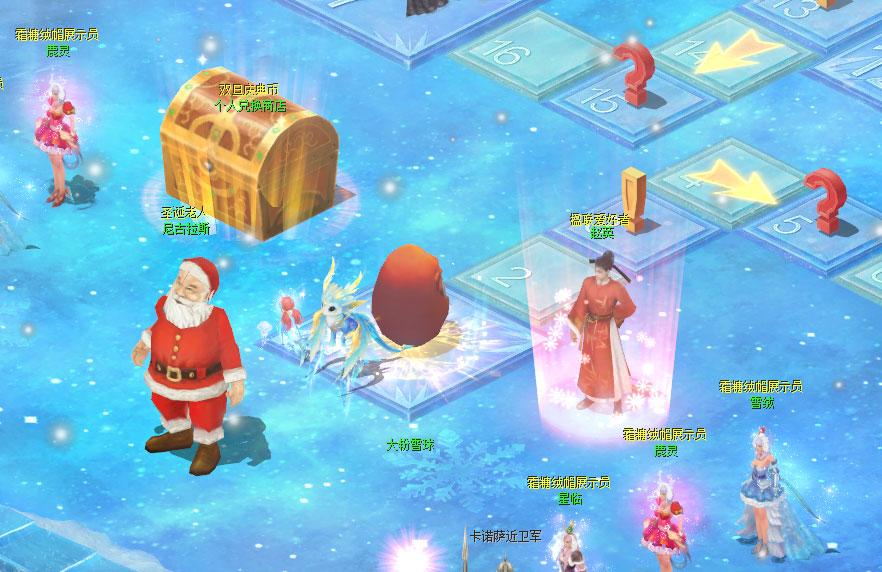 1、活动期间,满足条件的勇士可在圣诞老人·尼古拉斯处登上冰雪棋盘,使用骰子在棋盘上移动,触发各类趣味事件从而获取奖励。 2、骰子获取途径: ①参与“水晶球礼盒”活动,可获取幸运之骰、强运之骰、灌铅之骰等奖励。 ②参与“雪球大作战”活动,可获取幸运之骰奖励。 ③在圣诞老人·尼古拉斯处,每日可领取1次幸运之骰。 ④抵达冰雪棋盘17号格子时,可触发幸运之骰奖励事件。 3、趣味事件: ①进入7号格子,有机会获得好运小精灵的陪伴,让接下来获得的所有奖励翻倍。 ②进入12号格子,可通过许愿获得特定种类的奖励。 ③进入17号格子,可通过神秘的女占卜师获得大量幸运之骰。 ④进入21号格子,可获得大量双旦庆典币。 ⑤抵达终点,可进入彩蛋乐园收获海量惊喜。 |