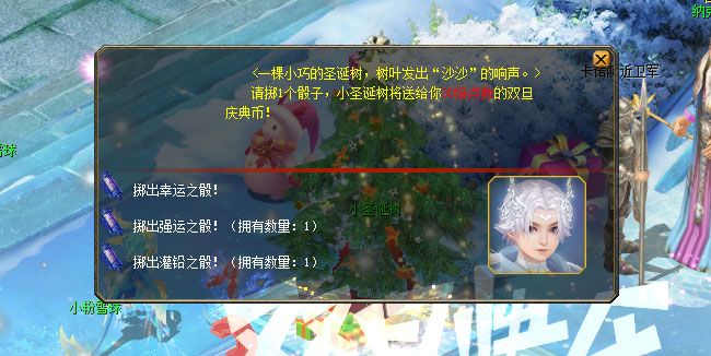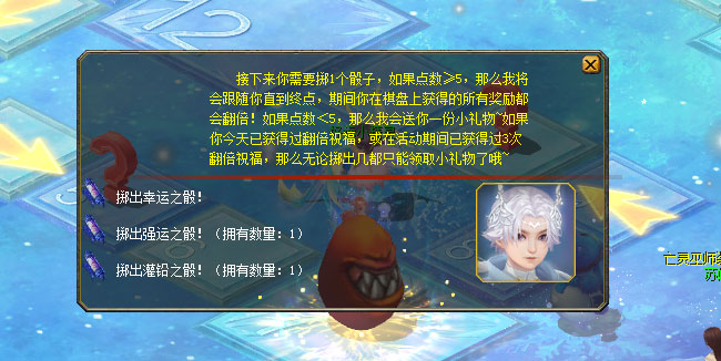在圣诞老人处领取了每日的幸运之骰后,你便开始了冒险! 在棋盘上,你会有许许多多的奇妙遭遇! 在7号格子上,你会见到神奇的好运小精灵。只要你掷出的点数大于等于5,就能得到小精灵的追随,从此刻起你在棋盘上获得的所有奖励都会翻倍,直到抵达终点为止!