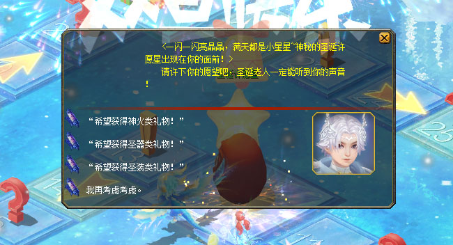 你继续投掷骰子前进,这次,你来到了12号格子位,遇到了奇妙的圣诞许愿星! 无需顾虑,你可以直接许愿你想要的奖励哦!