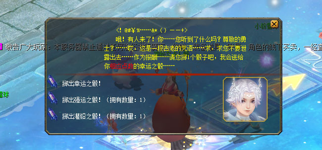 行走在冰雪铺就的街道上,卡诺萨城的雪景尽收眼底,到处都是盛典欢庆的气息。很快,你找到了那欢庆的来源——圣诞老人尼古拉斯,他雪白的胡子在阳光下闪闪发光,满脸的笑容让人感到无比的温暖。 圣诞老人热情地邀请你参与“冰雪大富翁”,在那个由冰雪构成的奇妙棋盘上,尽情地体验节日的乐趣。 在冰雪棋盘上行进,需要消耗骰子——你可在双旦庆典的各个活动中得到它们。 骰子共分为3种: 幸运之骰是最常见的骰子,掷出的点数在1~6之间。 强运之骰能为你带来好运,掷出的点数必定在4~6之间。 灌铅之骰是最强力的骰子,你可自由选择掷出的点数。 根据掷出的点数,你可在棋盘上前进相应的格子。