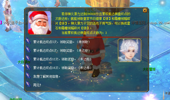 趣味的棋盘之旅告一段落,你在旅途之中收获的大量双旦庆典币,可以在双旦庆典个人商店中兑换你想要的精美礼品。 完成旅程之后,你可以从棋盘的起点重新开始游戏。若你在冰雪棋盘中多次抵达终点,还会有额外奖励等着你哦。 圣诞老人可是为你准备了皇家节日徽章、霜糖绒帽碎片等丰厚礼物!