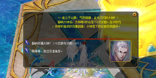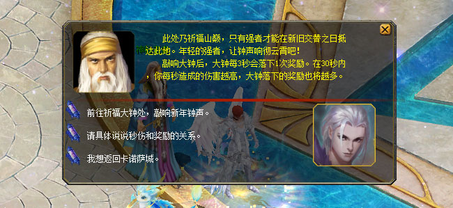 抵达祈福山巅后,你就可以看到等候在祈福大钟旁的神秘老者,如果你想咨询一些活动相关问题,他将知无不言。