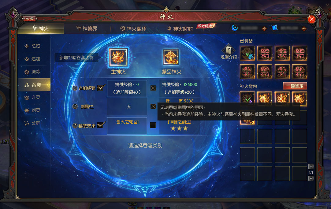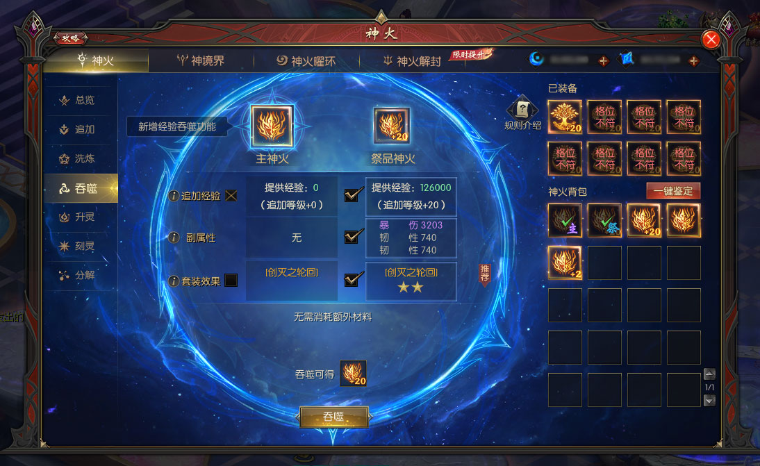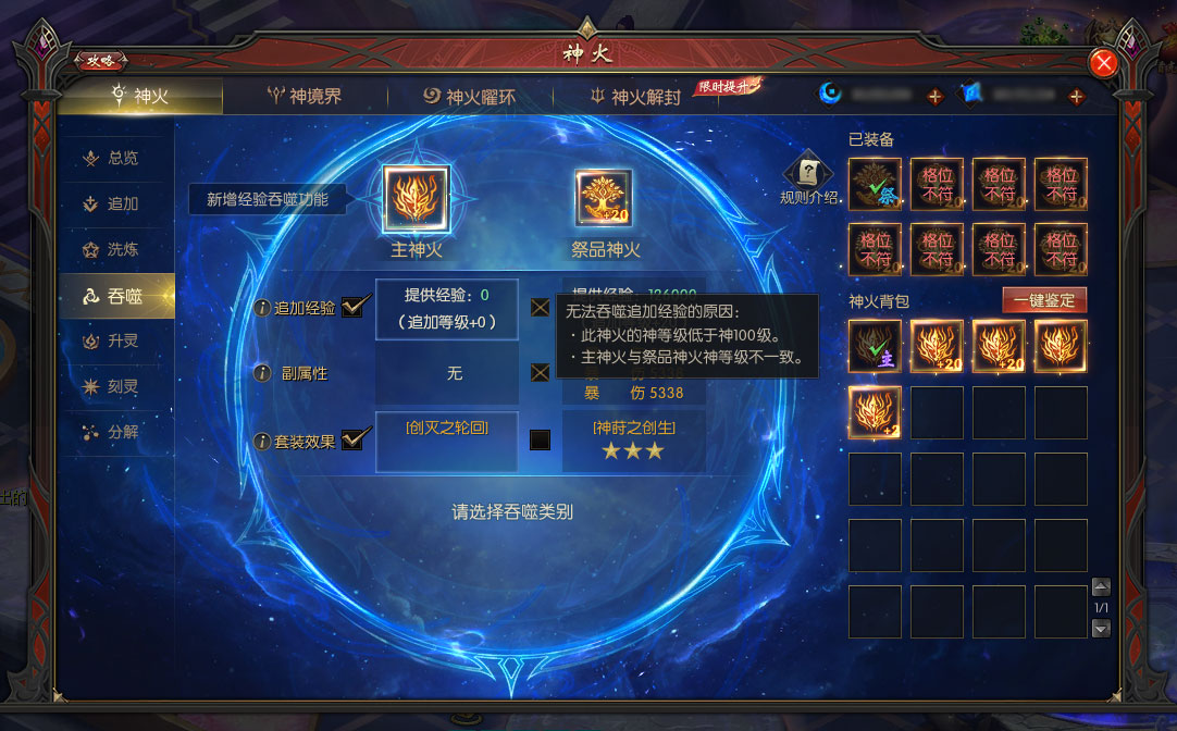 2、吞噬追加经验时,主神火与祭品神火需神等级相同。