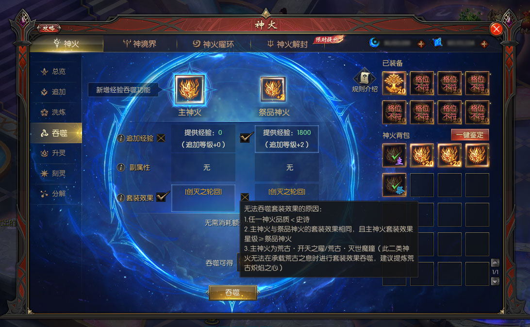不同神等级的神火进行吞噬时,只能保留主神火的追加经验;相同神等级且神等级在神100级或以上的神火进行吞噬时,可继承保留二者中追加经验较多一方的经验;吞噬副属性与套装效果时可自由选择继承保留哪一方的副属性与套装效果。