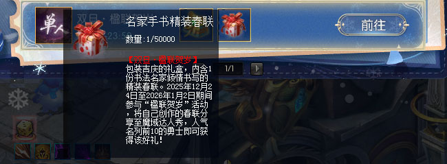 1、在卡诺萨城寻找楹联爱好者·赵英,可前往墨香书境创作春联——首次将自己创作的春联分享至魔域达人秀,即可获得1份楹联贺岁徽章礼【绑】! 2、魔域达人秀“楹联贺岁”专题活动持续期间,阁下可前往魔域达人秀欣赏佳作并为心仪的作品点赞。活动结束后,人气名列前10的勇士,可获得1份“名家手书精装春联”实物奖励! 注:魔域达人秀“楹联贺岁”专题活动开放时间为2025年12月17日至2026年1月2日。 |