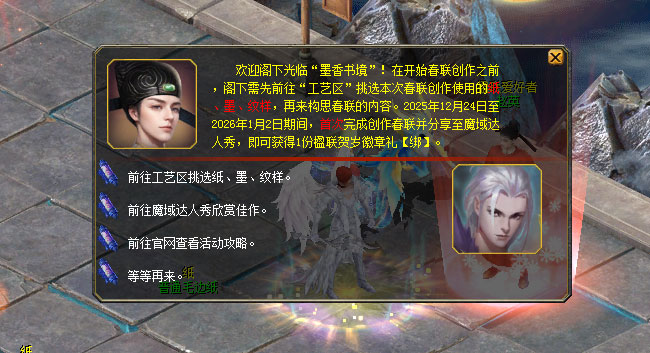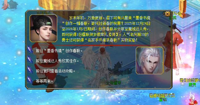 2025年12月24日至2026年1月2日期间,人物等级达到90级,成神且可驾驭三宠的勇士在卡诺萨城寻找楹联爱好者·赵英,即可前往墨香书境创作春联。 注:先锋区的活动时间为2025年12月17日至2025年12月26日。怀旧服活动参与条件为人物等级达到90级且可驾驭三宠。