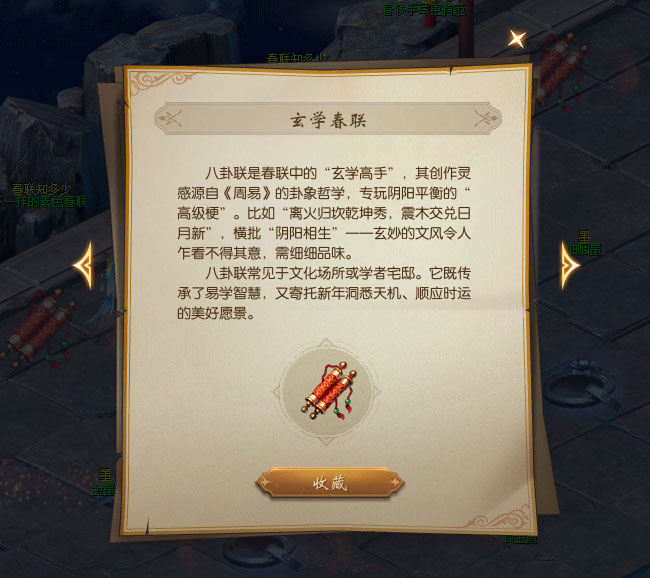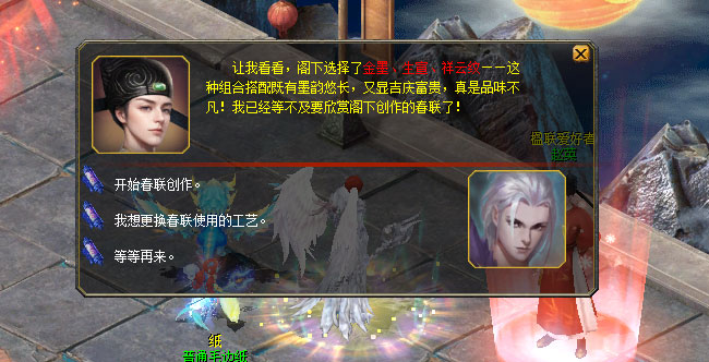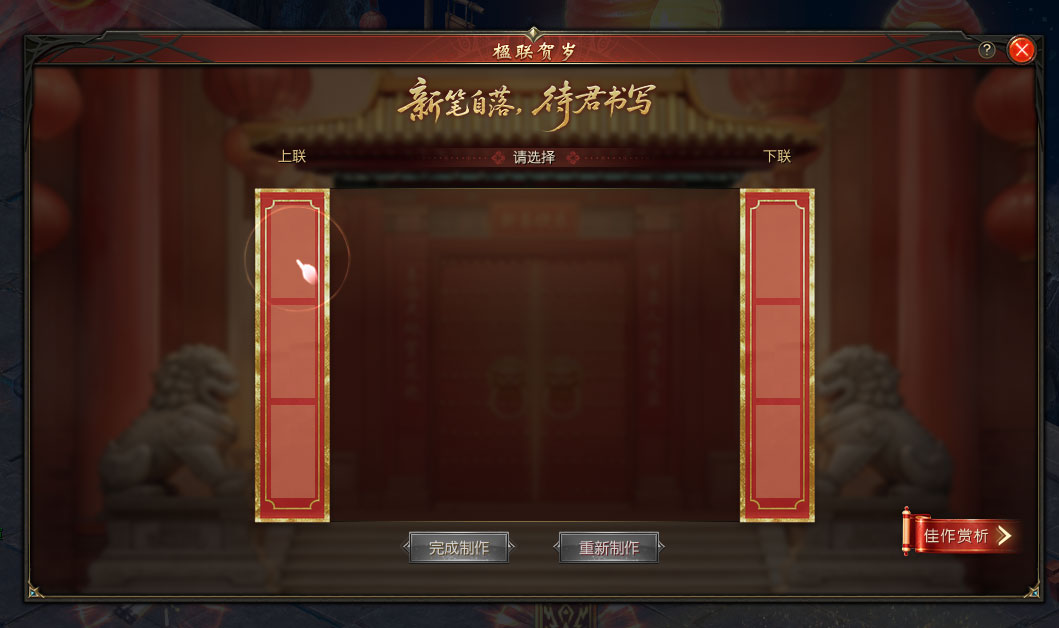 挑选好本次春联创作的工艺后,你与赵英交谈,准备大展文采创作春联了! 春联创作界面的上、下联共有六个填词位,点击填词位,下方将显现数十个可填入的字词。阁下可挑选心仪的字词点击填入,感受不同词汇组合带来的妙趣,直至创作出你满意的春联! 首次将自己创作的春联分享至魔域达人秀,即可获得1份楹联贺岁徽章礼【绑】!
