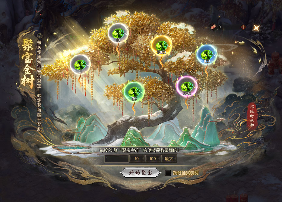 启动聚宝金树界面之后,每次投入“聚宝金符”都会获得随机数量的魔石奖品。根据每次投入的“聚宝金符”数量,可以获得对应倍数的奖品。