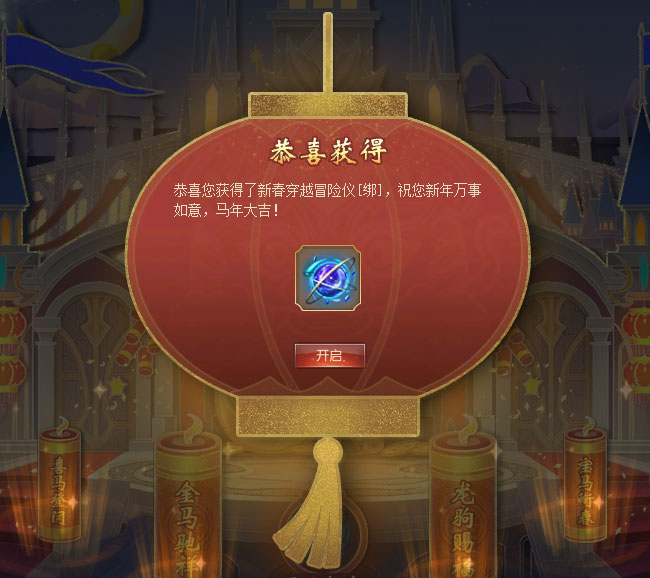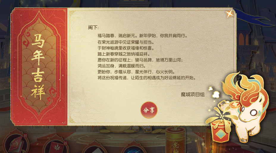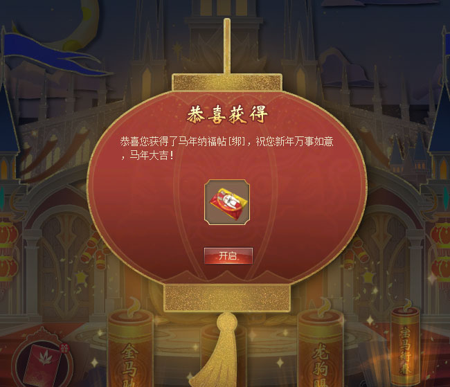 咦?这个“天马招财”是什么?快点开看看——原来是“马年纳福帖”!首次点开,你就收到了一份特别的新春祝福,你的“马年纳福帖”瞬间就提升了好多级!可以去领取对应等级的精美好礼啦!(点击查看“马年纳福”活动攻略) 这么厉害的等级提升,是一件极其幸运的事,活动期间仅能获得这1次噢。 再来看看这“喜马登门”——原来是新春签到礼!活动期间,阁下每日都可进行1次签到,完成签到可获得丰厚的签到好礼——有机会获得佣兵委托扫荡劵、璀璨荒古扫荡券、失落黄金城扫荡劵、财神红包等奖励! 对啦,财神红包可在财神秘境中使用,与朋友们分享财富与欢乐!(点击查看“财神大狂欢”活动攻略) 注:怀旧服完成新春签到,将有机会获得幻化好礼包、灵魂晶石小礼包、财神红包等奖励。 接着点开这个“金马驰祥”按钮,收下这份充满美好祝愿的“福马贺年卡”吧! 贺年卡上写有喜气满满的新春祝福,收下这份美好祝福后,新的一年一定更加幸福美满!