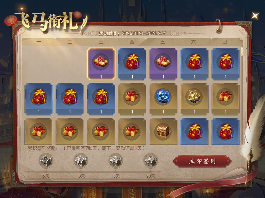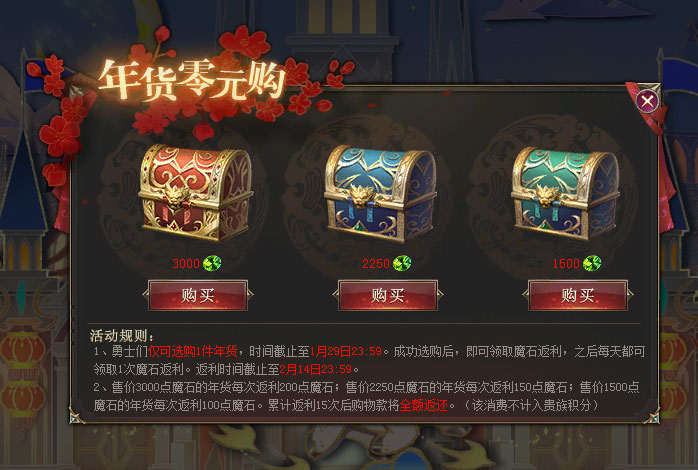 通过“瑞马贺年礼盒”界面,领取以下新春好礼。 1、【马年纳福帖】:仅能领取1次。首次开启可随机提升马年纳福帖等级。 2、【新春穿越大冒险】:新春穿越大冒险,迎春纳福锦绣行。旅游收集风物,赢取大量好礼。 3、【福马贺年卡】:贺年卡不限开启次数,开启贺卡可获得随机拜年祝福。 4、【新春签到礼】:每日领取1次。有机会获得佣兵委托扫荡劵、璀璨荒古扫荡券、失落黄金城扫荡劵等好礼。 注:怀旧服完成新春签到,将有机会获得幻化好礼包、灵魂晶石小礼包、财神红包等奖励。 5、【“福马贺岁”系列花灯玩具】: 非先锋区—— 2月7日至2月14日可领取1次15日时效的“花月鳞”背饰; 2月15日至2月23日可领取1次15日时效的“花月锦鳞·鎏金”背饰; 2月24日至3月3日可领取1次15日时效的“花月妙鳞”背饰。 先锋区—— 1月21日至1月28日可领取1次15日时效的“花月鳞”背饰; 1月29日至2月6日可领取1次15日时效的“花月锦鳞·鎏金”背饰; 2月7日至2月14日可领取1次15日时效的“花月妙鳞”背饰。 6、【年货零元购】:购买超值年货后,每日可享受1次魔石返利。(点击查看“新年乐购”活动攻略) 注:以上奖励均为不可交易、绑定属性。 |