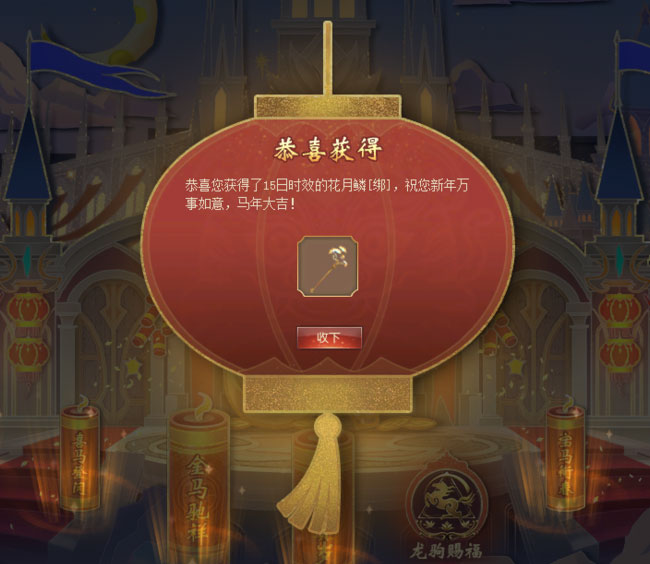 点击“龙驹赐福”按钮——原来在瑞马贺年礼盒中,还可以领取“福马贺岁”系列花灯玩具! 2月7日至2月14日期间(先锋区为1月21日至1月28日),可免费领取1份15日时效的“花月鳞”;2月15日至2月23日期间(先锋区为1月29日至2月6日),可免费领取1份15日时效的“花月锦鳞·鎏金”;2月24日至3月3日期间(先锋区为2月7日至2月14日),可免费领取1份15日时效的“花月妙鳞”!别忘了来领取哦! 最后点开“宝马衔春”按钮,哇塞,竟然是“年货零元购”!购买超值年货后,每日可享受1次魔石返利,直至已付货款全额返完——这就是新春的超级福利吗?真是太棒了吧!(点击查看“新年乐购”活动攻略) 升级马年纳福帖,参与新春穿越大冒险、荣光巡游以及情人节活动,可获得福马瑞币【绑】——可用于在福马献瑞礼品店中兑换精美好礼。 亲爱的冒险者,这个春节,希望领取了这些新春礼物的你,一整年都能吉星高照,好运十足! 注:以上奖励均为不可交易、绑定属性。 |