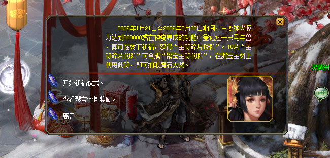 新年伊始,万象更新。灵曦树下一年一度的祈福仪式再次拉开了帷幕,在灵曦树下祈福即可获得珍贵的“金符碎片【绑】”——集齐10片“金符碎片【绑】”,即可合成1张“聚宝金符【绑】”。